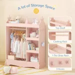 - Ample Storage Space: The wardrobe measures 44.1 x 33.5 x 13.4 inches and includes multiple compartments for clothes, shoes, hats, and toys. The design features a hanging rack for dresses, a top shelf for toy storage, cubbies for decoration, and hooks for jewelry and bags.