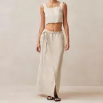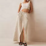 Step into timeless summer style with this 100% Linen Retro Midi Skirt, designed to bring a breath of fresh, vintage-inspired charm to your wardrobe. Soft, airy, and naturally breathable, this skirt is the ultimate go-to for sunny days and balmy evenings. Crafted from a high-quality cotton-linen blend, it offers a refined yet relaxed silhouette that floats comfortably against the skin. Whether you’re strolling through a weekend market or meeting friends for an alfresco lunch, this skirt promises to elevate your warm-weather look with grace and ease. With its ankle-grazing length, soft empire waistline, and chic side split, this skirt combines feminine sophistication with everyday wearability. The lace-up tie detail at the waist adds a romantic French touch, while the non-stretch fabric keeps its structure beautifully. Designed in a classic solid color, it’s the perfect canvas for endless outfit combinations — pair it with your favorite tucked-in blouse or a casual tee for effortless style.Why You’ll Love It