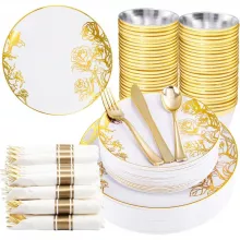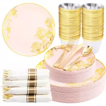 Use our battle tested marketing materials for 210PCS Pink and Gold Disposable Dinnerware Set for Parties & Events