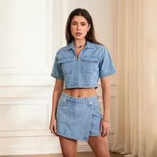 Use our battle tested marketing materials for Women's 2 Piece Denim Short Sleeve Top & Asymmetrical Shorts Set