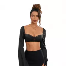 Use our battle tested marketing materials for Women’s Long Sleeve Mesh Crop Top with Lace Trim & Tie-Up Back