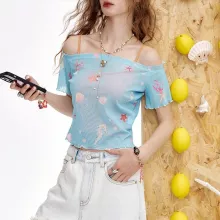 Use our battle tested marketing materials for Y2K One Shoulder Blue Cartoon Print Slim Fit Summer Tee for Women