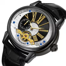 Crafted with a black alloy case measuring approximately 1.8 x 1.7 inches, this timepiece offers a distinct oval shape that sets it apart from conventional designs. The crisp white dial is accented with silver Roman numeral markers, while the black genuine leather strap adds a rich, timeless touch. At the heart of the watch is a self-winding automatic movement, showcasing the intricate tourbillon mechanism — a symbol of high watchmaking tradition and mechanical precision.