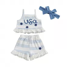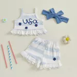 Make your little one the star of every summer celebration with this sweet and stylish baby girl Fourth of July outfit. Featuring a charming sleeveless ruffle tank top, matching shorts, and a coordinating headband, this 3-piece set is the perfect blend of comfort and patriotic flair. Whether you're headed to a family BBQ, parade, or just enjoying a sunny day at the park, your baby girl will be photo-ready and festive in this adorable set. Designed for babies and toddlers from 0 months to 3 years, the outfit is made with a soft, breathable blend of polyester and elastane that’s gentle on delicate skin and ideal for spring, summer, and early fall wear. The lightweight fabric ensures your baby stays cool and comfortable even on warmer days. The sleeveless top features cute ruffle details that add a playful, girly touch, while the elastic waistband on the shorts allows for a snug yet flexible fit. Topped off with a matching headband, this set brings the perfect finishing touch to your baby’s festive look.Product Features