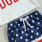 Let your little one join the patriotic fun in adorable comfort with this charming toddler boy’s 4th of July outfit. Featuring a playful short sleeve letter print t-shirt paired with stylish knot-front shorts, this set is perfect for festive family gatherings, backyard BBQs, and summer parades. Whether he's watching fireworks or enjoying a picnic, your baby boy will be dressed for the occasion in a look that’s both cute and comfy. Made with a soft and breathable cotton-blend fabric, this outfit is gentle on delicate skin while being tough enough to handle an active little explorer. The fabric retains its shape and color even after multiple washes, ensuring your little one looks his best all summer long. Designed with convenience in mind, the pullover style and elastic waistband allow for quick and easy dressing.Product Features