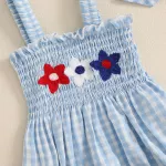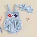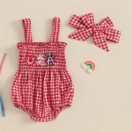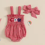 Dress your little firecracker in the cutest patriotic outfit of the season! This adorable 2-piece baby girl 4th of July outfit is designed for sunny summer days, backyard barbecues, and festive family photos. The set includes a shirred sleeveless romper with classic plaid pattern and sweet letter embroidery, paired with a matching headband for a complete, picture-perfect look. Made with soft, stretchy fabric for all-day comfort, it’s the ideal outfit for your baby girl’s first Independence Day celebration. Whether she's watching fireworks in your arms or crawling around during a family picnic, this outfit delivers both comfort and charm. The lightweight cotton blend keeps her cool, while the elasticized design ensures a snug yet gentle fit. Available in multiple sizes from 0 to 18 months, it's the go-to outfit for any patriotic event this summer.Why You’ll Love It