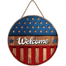 Use our battle tested marketing materials for Patriotic Wooden Door Hanger – Round Independence Day Flag Sign Decor
