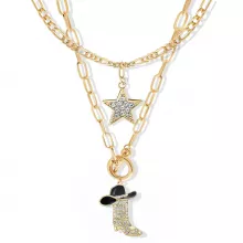 Crafted from durable stainless steel and zinc alloy, this necklace is made to shine and stay strong. The double-layered chain design adds depth and character, giving your neckline a chic layered look with zero effort. The standout pendants—boot, hat, and star—are finely detailed and thoughtfully spaced, creating a balanced, fashion-forward accessory that’s easy to pair with anything from denim jackets to flowing maxi dresses.