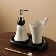 Bring a touch of modern elegance to your bathroom with this ceramic dispenser and cup set—a beautifully designed duo that combines function with style. Crafted from high-quality ceramic, this set includes a lotion or shampoo dispenser and a matching mouthwash or tumbler cup. It's the perfect upgrade for any bathroom, whether at home, in a guest suite, or in a hotel setting.