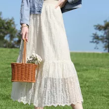 Use our battle tested marketing materials for French Apricot Embroidered Lace A-Line Skirt – Spring Mid-Calf Retro Chic