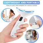 The sleek dolphin curve design is engineered to fit perfectly along the contours of your neck and face, delivering precise treatment while being lightweight and ergonomic. With three vibration levels, three intensity settings, and three LED light modes (red, blue, and violet), it targets a variety of skin concerns from dullness and puffiness to sagging and tension.