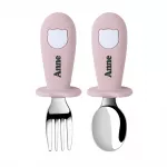 The set includes a matching spoon and fork, both lightweight and perfectly sized for toddlers aged 3 months and up. Whether at home, at daycare, or out for a family meal, this set brings safety, ease, and a touch of personalized charm to the table.