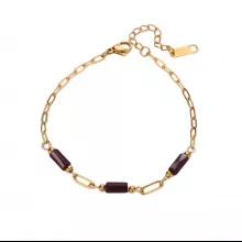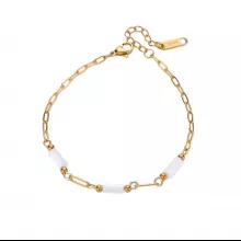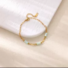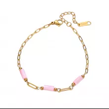 This bracelet is crafted from durable stainless steel, known for its lasting strength and resistance to tarnishing. It features a classic link chain measuring approximately 7.5 inches in length, making it suitable for most wrist sizes. Soft pink geometric beads are bezel-set into the gold-toned chain, creating a stunning contrast that’s both subtle and striking. The lobster-claw clasp ensures a secure and comfortable fit all day long.