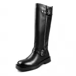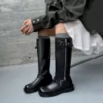 Step into timeless style with these Genuine Leather Knee-High Flat Boots, designed to blend fashion-forward simplicity with all-day comfort. With their sleek British-inspired silhouette, these boots make a subtle yet striking statement — ideal for everything from a crisp autumn walk to casual workdays and stylish weekend outings. The smooth leather upper, thick flat sole, and bold buckle detail come together in a modern design that’s equal parts edgy and refined. Whether you're dressing them up with a midi dress or down with skinny jeans, these boots add instant polish to your look. A round toe and low square heel make them supremely wearable, while the zipper closure ensures easy on-and-off convenience. Lined with soft plush on the inside, they’re cozy enough for cooler seasons yet lightweight for daily wear. Built from durable materials and shaped with care, these boots are made to last — and designed to turn heads.Product Features