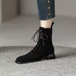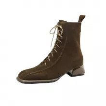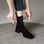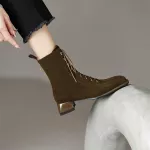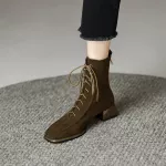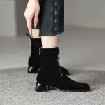 Looking for a statement piece that blends fashion with everyday wearability? These Square Toe Suede Ankle Boots are your new go-to for cool-weather style. With a sleek rear zipper, a modern lace-up front, and a comfortable square heel, these boots are made to turn heads and keep you feeling confident from the sidewalk to the cafe. Crafted from premium cow suede and lined with ultra-soft short plush, these ankle boots offer cozy warmth without compromising on looks. Their mid-height chunky heel (about 1.6 inches) gives just the right amount of lift while still being practical for all-day wear. Whether you're hitting the streets or dressing up for a casual outing, these boots make a bold yet versatile addition to your wardrobe. Designed with a unique retro flair, they hit just above the ankle — the perfect height to pair with jeans, skirts, or trousers. The solid color and minimalist design make them easy to style, while the quality materials and stitching ensure they’ll last season after season.Why You’ll Love These Ankle Boots