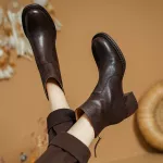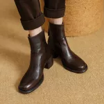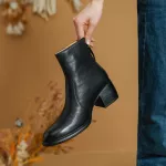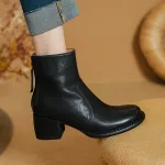 Elevate your style and comfort with these stunning women’s ankle boots, designed to combine fashion with everyday functionality. Crafted from genuine cow leather, these boots offer durability and a luxurious feel, making them a must-have for your wardrobe. The chic round toe design and square high heel provide a polished look that seamlessly transitions from the office to evening outings. Whether you're walking through city streets, heading to work, or enjoying a night out, these boots keep you stylish and comfortable. The short plush lining and soft insole offer warmth and cushioning, perfect for chilly days. A practical zip closure ensures easy wear while maintaining a sleek silhouette that pairs effortlessly with dresses, skirts, or tailored pants.Key Features
