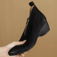 Use our battle tested marketing materials for Women's Cow Leather Pointed Toe Ankle Boots with Side Zip – Casual Wedge Heel Booties