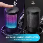 Say goodbye to awkward sound mishaps with the tap-to-mute sensor and RGB light indicator. A quick tap mutes your mic instantly, while the glowing ring lets you know whether you’re live or silent. Adjusting your audio has never been smoother—just twist the hidden gain control knob at the bottom to find your perfect sound level without cluttering your desk setup.Built for Smooth, Professional Audio