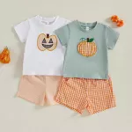 Dress your baby boy in the perfect blend of festive fun and everyday comfort with this 2-piece Halloween outfit set. Featuring a soft short-sleeve T-shirt with a playful pumpkin print and matching elastic plaid shorts, this set is made for making memories. Whether it’s for a Halloween party, a family photo, or just a day of fun, your little pumpkin will look absolutely adorable.Product Features