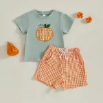 This outfit is thoughtfully designed for both comfort and style. The T-shirt is made from a breathable cotton blend with a round neckline and short sleeves, keeping your child cool during warm fall days. The plaid shorts come with an elastic waistband, ensuring a snug yet gentle fit for active little ones. With its festive pumpkin print and classic plaid design, this set makes dressing up both simple and stylish.- Playful pumpkin print on a soft short-sleeve T-shirt