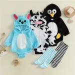 Make your little one the star of Halloween with this Baby Halloween Costume Romper with Stockings. Designed for both baby girls and boys, this 2-piece set includes a soft zip-up hooded romper and matching stockings. Available in fun designs like Cow, Penguin, or Monster, it’s perfect for dressing up your baby in the cutest way possible. The playful hood and charming patterns make it a must-have for family photos, trick-or-treating, or fall parties.Cozy and Comfortable Design