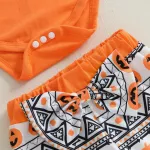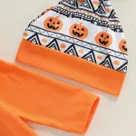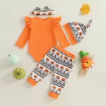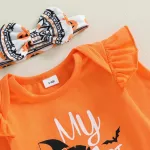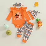 Make your little one the star of this spooky season with this 4-piece baby girl Halloween outfit. The set includes a long-sleeve letter print romper, playful pumpkin print pants, a matching headband, and a cute hat—everything you need for an easy, picture-perfect outfit. Designed with comfort and style in mind, this set is perfect for trick-or-treating, family gatherings, or simply celebrating fall in festive fashion.Product Features