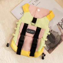 - Design: Open-buckle two-legged vest with cute backpack detail