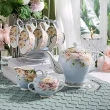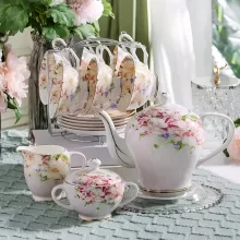 Use our battle tested marketing materials for Elegant Pink Blue Floral Bone China Tea & Coffee Set with Teapot and Accessories