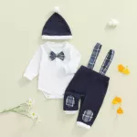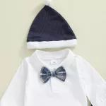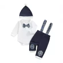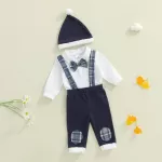 Turn everyday moments into picture-perfect memories with this adorable baby boy outfit. Designed for comfort and charm, this set includes a long sleeve romper with a classic turn-down collar, matching plaid overall pants, a smart bow tie, and a stylish hat. Whether for family gatherings, holidays, or milestone photos, your little one will look like the perfect little gentleman.Product Features