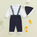 This baby boy outfit blends timeless style with soft comfort, making it ideal for special occasions or casual autumn days. The romper is made of 95% cotton with a touch of elastane for a gentle, stretchy fit, while the plaid pants add a fashionable touch with their polyester blend. Easy to put on and designed for all-day wear, this outfit ensures your little one stays cozy without compromising style.- Complete Set: Includes romper, bow tie, plaid overall pants, and matching hat.
