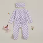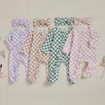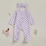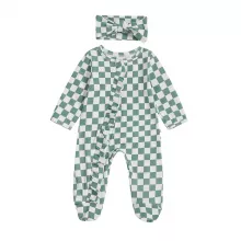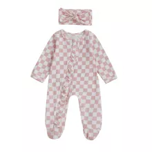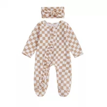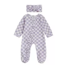 Dress your baby girl in cozy, picture-perfect style with this charming 2-piece fall footies bodysuit and headband set. Designed for newborns and infants up to 3 months, this romper combines warmth, softness, and irresistible cuteness. The trendy checkerboard pattern and delicate ruffle trim add a touch of playful fashion, while the easy zip-front closure makes dressing and diaper changes quick and stress-free.Product Features