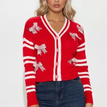 This piece isn’t just another winter sweater—it's a stylish blend of Y2K nostalgia and festive flair. The candy-bow look and diamond accents give it a sweet holiday touch, while its comfortable, non-stretch fine-yarn knit ensures a premium feel. Designed for seasonal fun but wearable year-round, it brings joy, comfort, and style together in one must-have cardigan. Bring home your new favorite holiday essential and enjoy a cute, cozy, confidence-boosting look all season long. Upgrade your winter wardrobe today!SIZE CHART