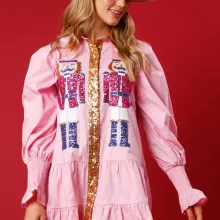 Step into the magic of the season with this stunning Women’s Christmas Sequin Nutcracker Mini Dress. Designed to bring holiday cheer wherever you go, this long-sleeve, glitter-accented shirt dress blends comfort, charm, and eye-catching shine. Its playful Nutcracker-inspired print and shimmering details make it an irresistible choice for festive gatherings, family photos, themed events, or simply adding sparkle to your seasonal wardrobe.Product Features