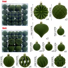 48-piece velvet green flocked ornament set. Each ball is designed to add a soft, luxurious texture and a deep festive color to your tree, garland, wreath, or tabletop display. The rich green shade blends beautifully with classic red and gold decorations or modern neutral themes, making it perfect for any holiday style.