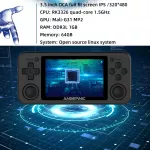- Powered by the RK3326 quad-core 1.5 GHz CPU and Mali-G31 MP2 GPU, ensuring fast performance and seamless gameplay.