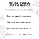 Unlike generic travel guides, our "Japan in Two Weeks" guide is specifically designed for first-time visitors. It combines detailed itineraries with local insights, AI-powered trip planning, and smart tips for staying on budget. You'll get more than just a list of sights – you’ll receive a customized travel experience that includes not only the must-see spots but also local hacks for smoother travel.Practical Benefits:
