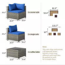 Elevate your outdoor living with the All-Weather Grey 5-Piece Outdoor Wicker Sectional Sofa Set, complete with a glass coffee table and plush blue cushions. Whether you're hosting a barbecue, enjoying a sunny day, or relaxing with a good book, this modern, versatile furniture set is perfect for any occasion. The sleek grey finish combined with the vibrant blue cushions adds a touch of style to your garden, patio, or poolside area.Key Features: