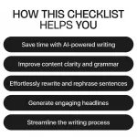 This checklist is the ultimate tool for anyone looking to improve their writing process without spending hours on tedious editing. Free AI writing tools are a game-changer, but using them efficiently requires knowledge of how to integrate them seamlessly into your workflow. Here’s what you get when you download: