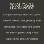 Inside this guide, you’ll discover creative ways to rethink unused areas in your home and turn them into productive growing spaces. From container gardening to vertical setups and indoor herbs, every chapter is designed to help city dwellers bring nature closer to home. You’ll also learn how modern tools like AI can simplify garden planning and plant care, making urban gardening smarter and more efficient than ever.