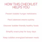Unlike complicated meal plans or lengthy parenting guides, this resource is designed to be quick, practical, and easy to use. It focuses on realistic snack options that parents can prepare in minutes, using everyday foods toddlers already enjoy. The checklist format allows you to glance at it while packing bags so you never forget essential snack components.