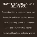 This checklist is designed for apartment cat owners, indoor cat parents, busy pet lovers, and anyone searching for practical cat enrichment ideas for small apartments. If you want your cat to stay active, curious, and emotionally satisfied even in a limited space, this guide gives you the tools to make it happen.