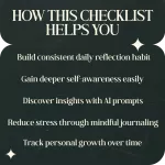Unlike traditional journaling guides, this checklist introduces a dynamic approach by integrating AI-generated prompts. This means your reflections never feel repetitive—each session opens the door to new perspectives, deeper questions, and meaningful discoveries tailored to your current mindset.