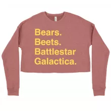 Use our battle tested marketing materials for Women's Cropped Fleece Bears Beets Battlestar Galactica Sweatshirt - BSG Sweatshirt