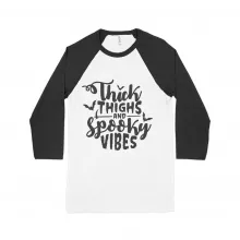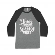 Use our battle tested marketing materials for Thick Thighs & Spooky Vibes Women's 3/4 Sleeve Baseball T-Shirt
